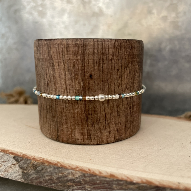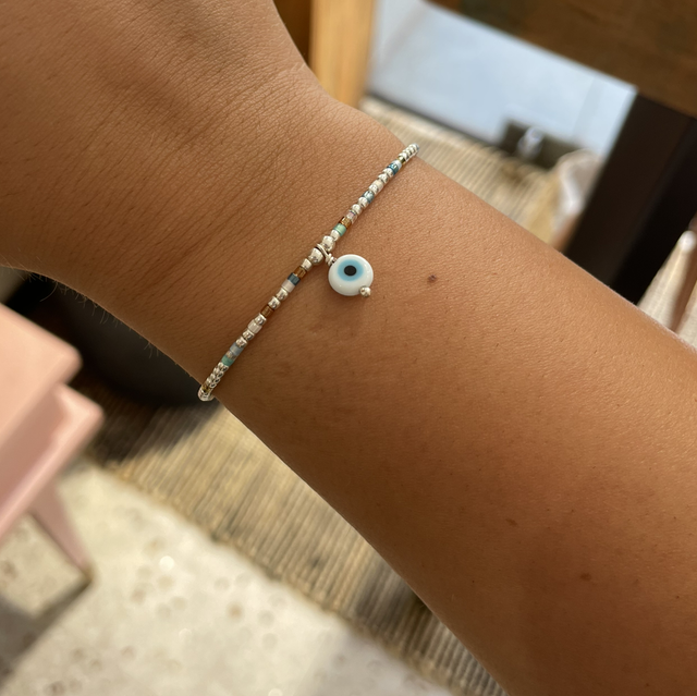 Bracelet composé d’éléments en argent 925, de verroterie multicolore et d’un œil porte bonheur en nacre.