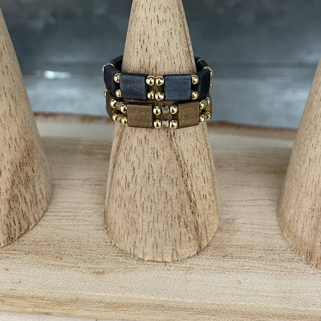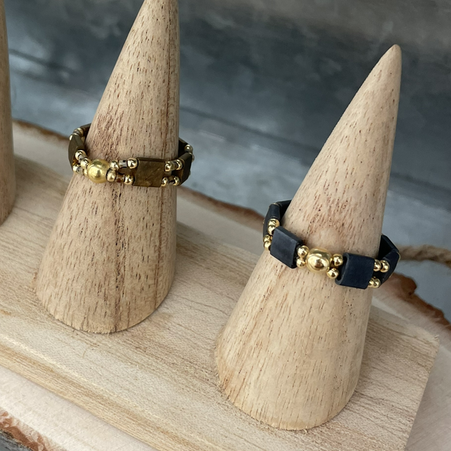 Bague montée sur silicone extensible, composée d’argent 925 doré à l'or fin et de verroterie.