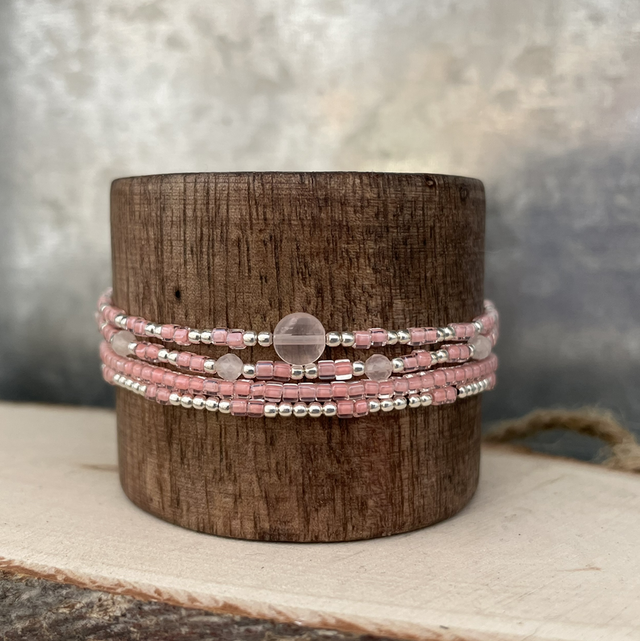 Bracelet composé d’éléments en argent 925 et de verroterie rose.